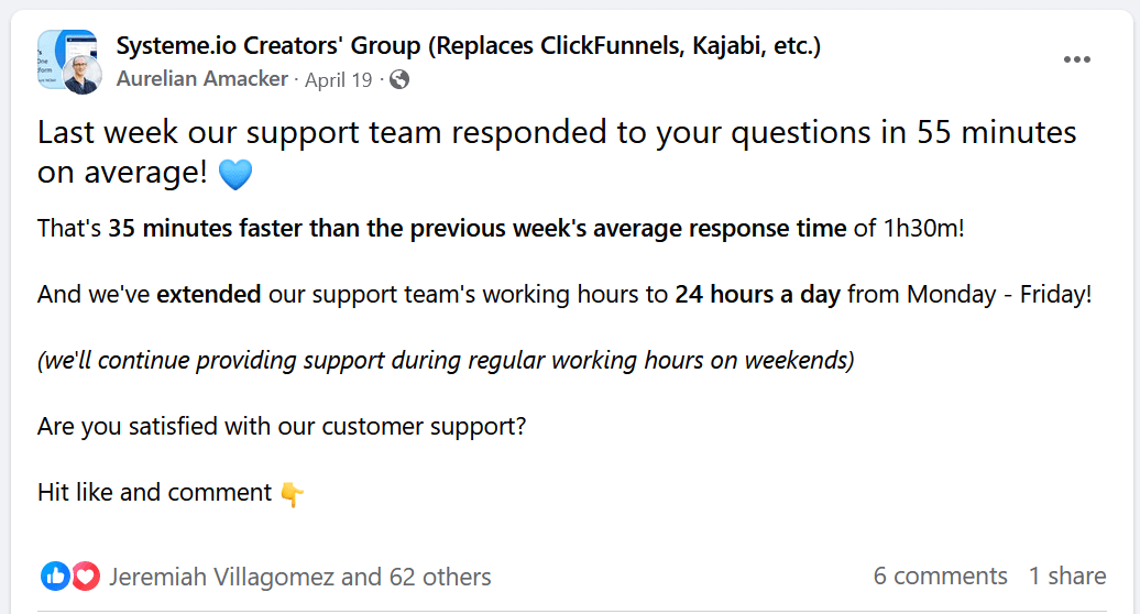 The support team at Systeme is phenomenal. In fact, the founder of Systeme.io even posted this on his Facebook pageβ¦